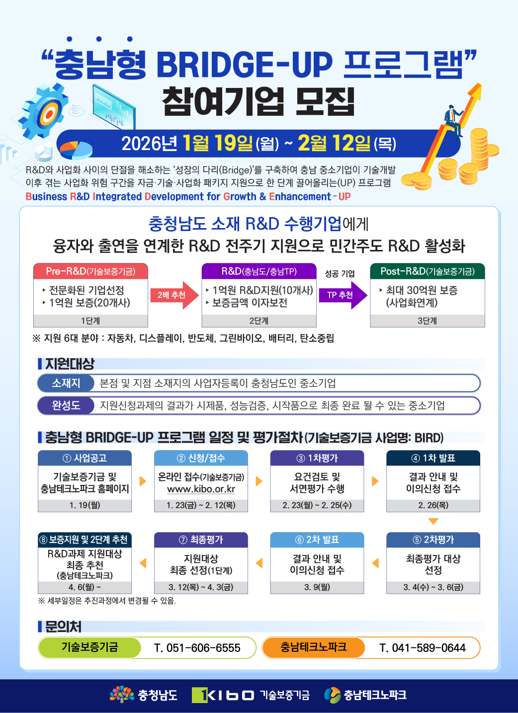 융자(보증)와 출연을 연계한 R&D 전주기 지원 제도인 「충남형 BIRD 프로그램」 참여기업 모집 및 지원계획을 아래와 같이 공고하였습니다.